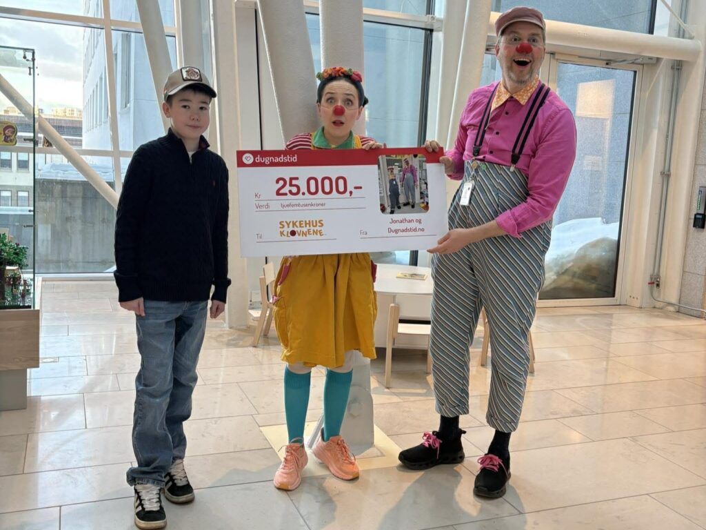 For å gi noe tilbake kunne Jonathan overrekke Sykehusklovnene kr 25.OOO,- fra Dugnadstid. Overrekkelsen skjedde på sykehuset i Bodø, der klovnene Zapp og Falleri og Fallera tok imot sjekken. Familien var til stede.